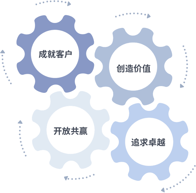 成就客户是一切决策的出发点,,创造价值是衡量所有工作的标准,,,追求卓越是我们做事做人的态度,,,,开放共赢是我们的格局也是最终的结果。。。。价值观的齿轮环环相扣,,推动着组织里的每个人不断向前。。。。